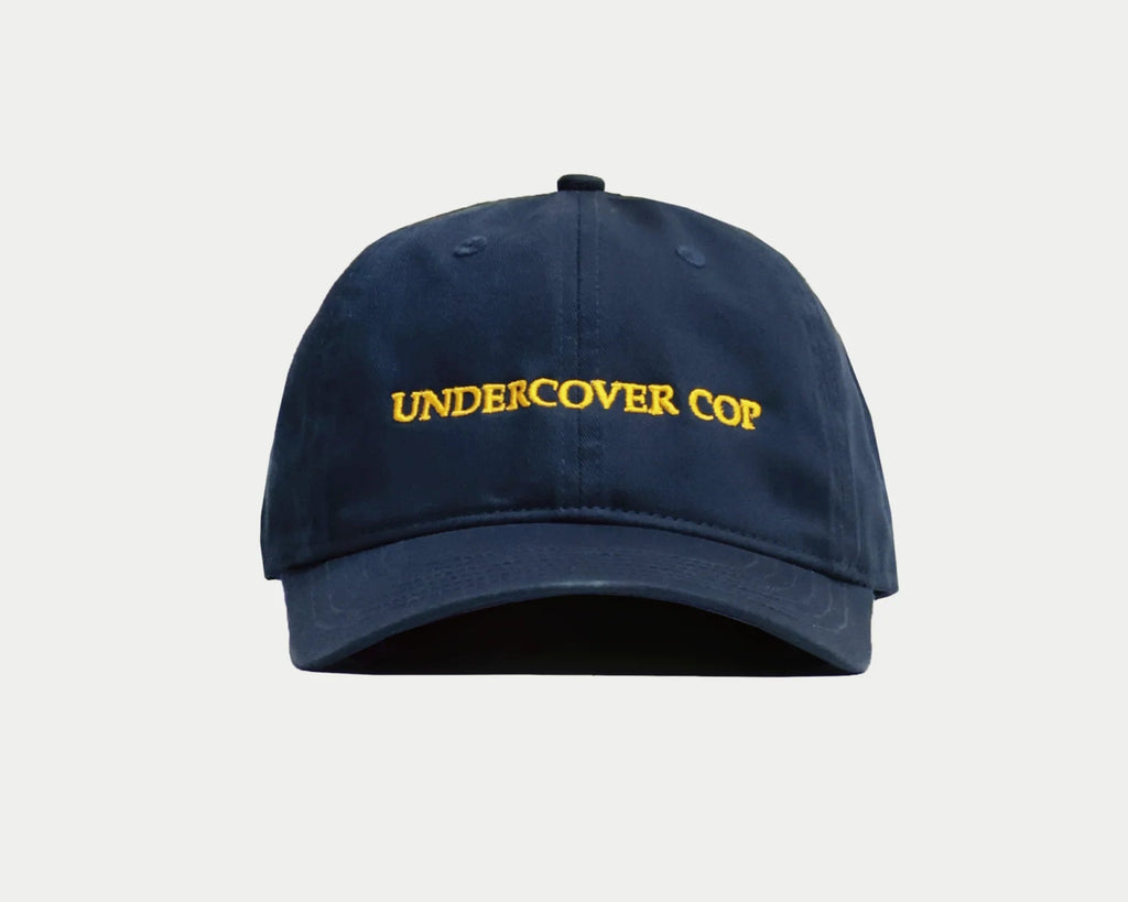 100% Bio-Baumwolle IDEA Hut. UNDERCOVER COP in gelber Stickerei auf der Vorderseite. Klassisches IDEA auf der Rückseite. Navyblauer, klassischer unstrukturierter Sechs-Panel-Hut aus 100% Bio-Baumwolle. Umweltbewusst :)